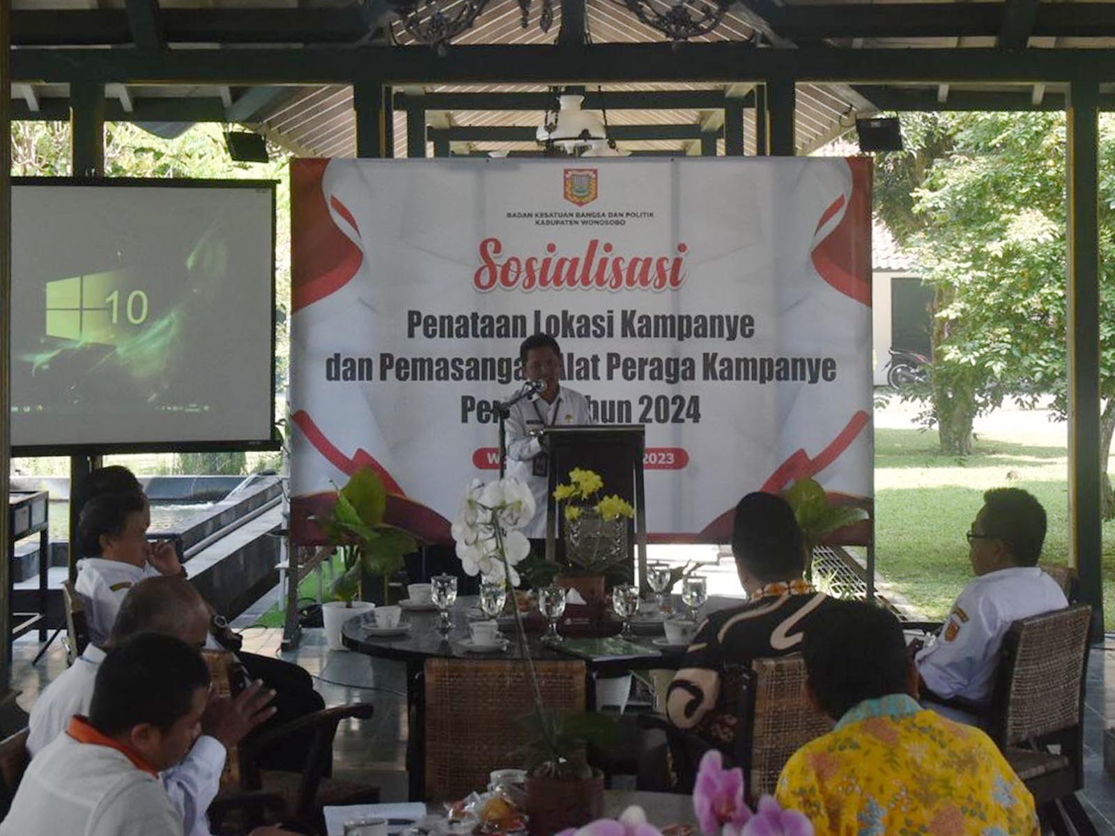 Ciptakan rasa yang aman, nyaman dan tertib selama masa kampanye dan pemilihan umum 2024, Pemerintah Kabupaten Wonosobo melalui Badan Kesatuan Bangsa dan Politik (Kesbangpol) selenggarakan sosialisasi Penataan Lokasi Kampanye dan Pemasangan Alat Peraga Kampanye Pemilu Tahun 2024, Rabu (9/8/2023) di Pendopo Utara.